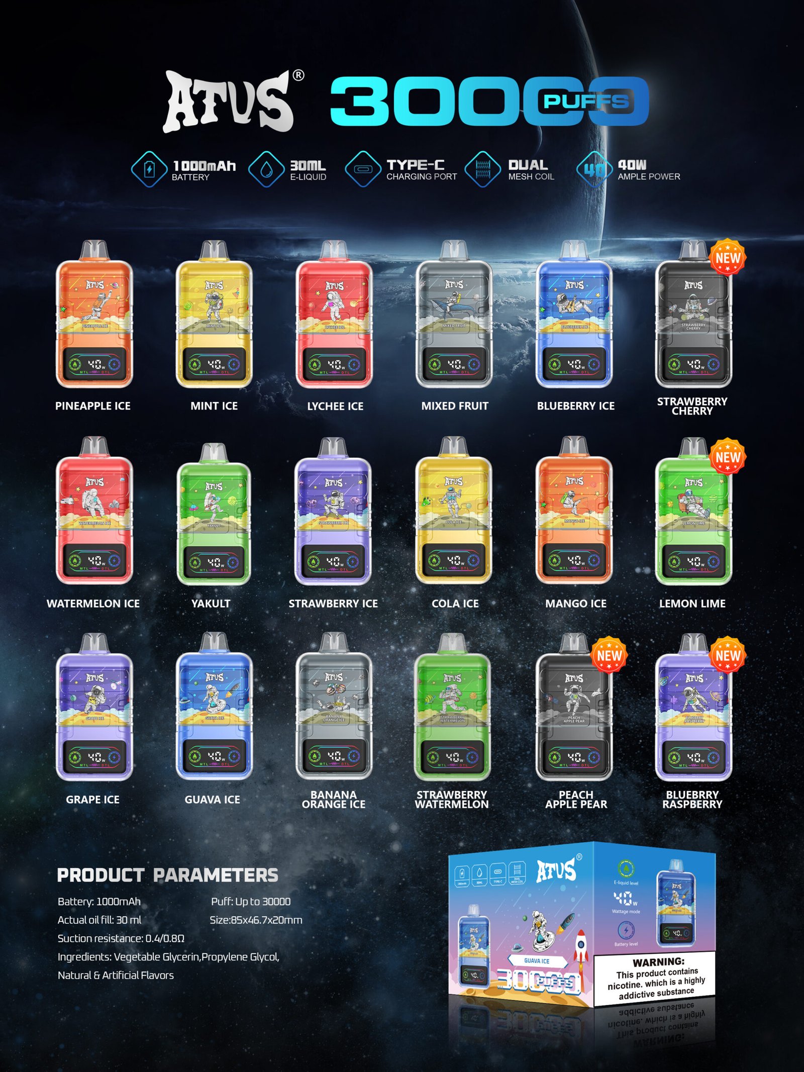 Az ATVS Astronaut 30000 Puffs eldobható e-cigaretta 25ml e-folyadék kapacitással30,000 puff élettartammal, 5% nikotinsóval és duál mesh tekercsekkel kínál prémium vaping élményt. Az újratölthető 1000 mAh akkumulátor és a Type-C USB töltés kényelmes használatot biztosít. A LED kijelző segít nyomon követni a maradék e-folyadékot és az akkumulátor szintjét.