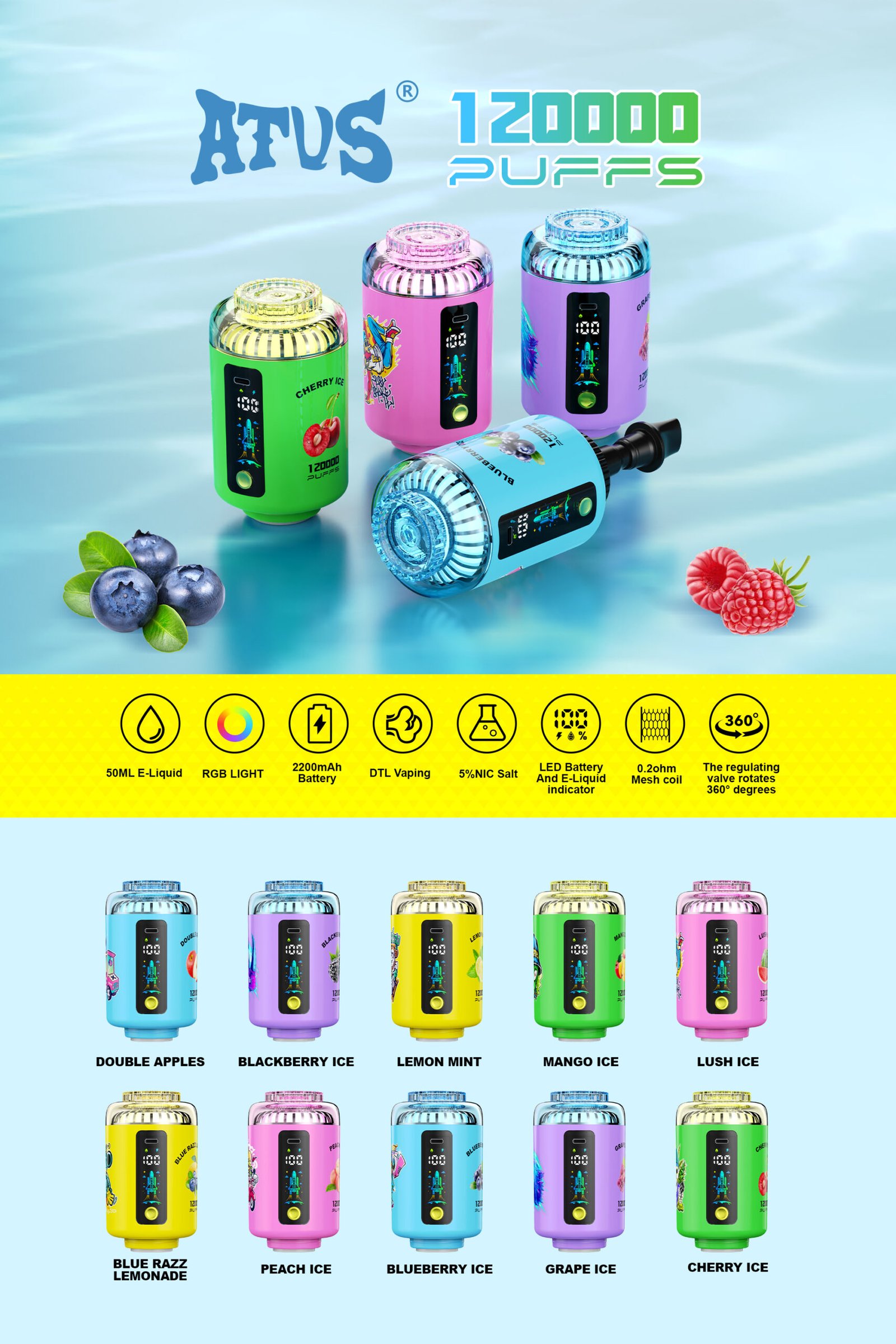 Az ATVS Hookah Head 120K Puffs egy prémium vízipipa (shisha) eldobható vape, amely a hosszú élettartamot és a gazdag ízélményt ötvözi. Ez a vízipipa fej (hookah head) lehetővé teszi a felhasználók számára, hogy akár 120,000 puffot élvezhessenek egyetlen készülékkel, köszönhetően a 50 ml-es e-folyadék tartálynak és a 2200 mAh-s újratölthető akkumulátornak.