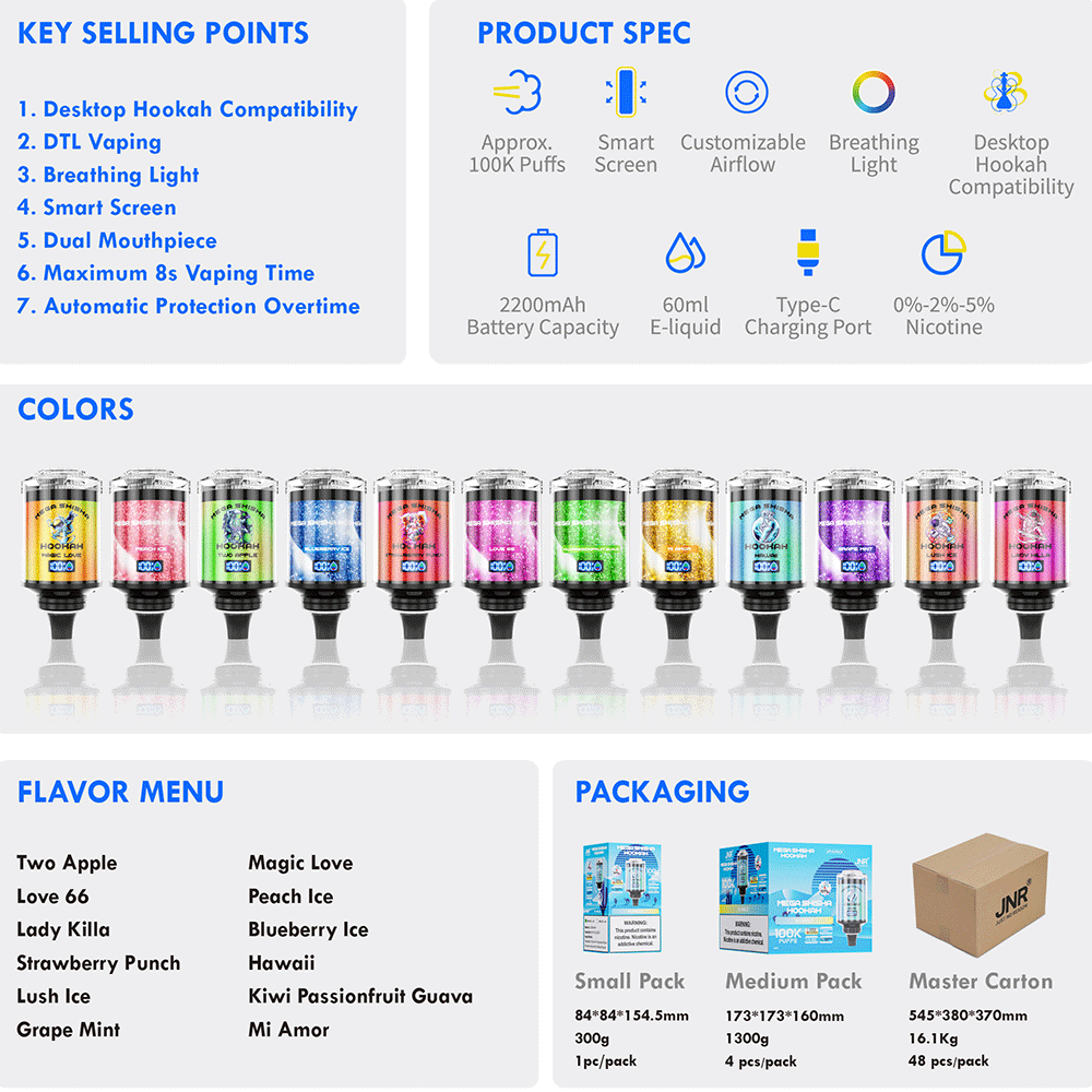 A JNR Mega Shisha Hookah 100 000 slukkos eldobható vape forradalmi választás azok számára, akik hosszan tartó vape élményt keresnek prémium funkciókkal. Akár hihetetlen 100 000 slukkot is képes felmutatni, így ez az eszköz ideális a hosszan tartó, egyenletes és kielégítő gőzölést biztosító használatokhoz.